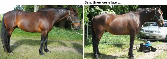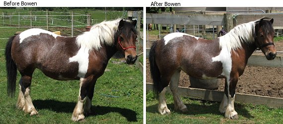 She was not standing square for this photo, but it does show that before the bowen she was standing under. Also note the muscle tone of the hind leg after the bowen. Her coat is glossier and not as course. Also note the bracio muscles in her neck are now less-pronounced. Her posture and way of going has improved.